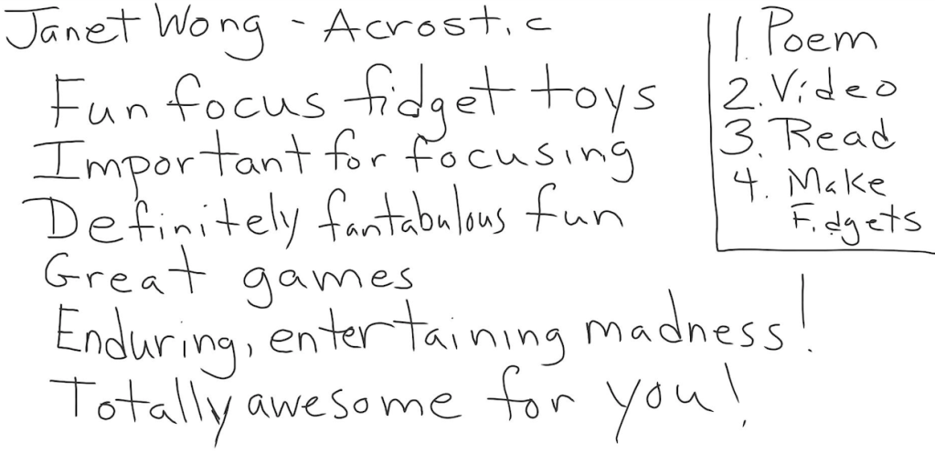I had not planned to create lesson on fidgeting, but the girls kept talking about their need to move and how teachers often become upset by their fidgeting. Though I have a high tolerance for my own fidgeting, I often get distracted by students’ fidgeting. I have had to become keenly aware of this and learn to tune out a certain amount of that type of distraction. And I have had to have quiet, honest conversations with students about how best to navigate their need to fidget and others’ needs for sustained attention.