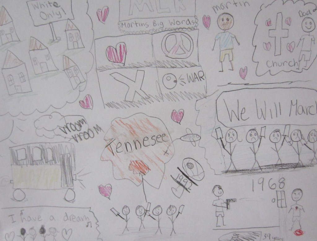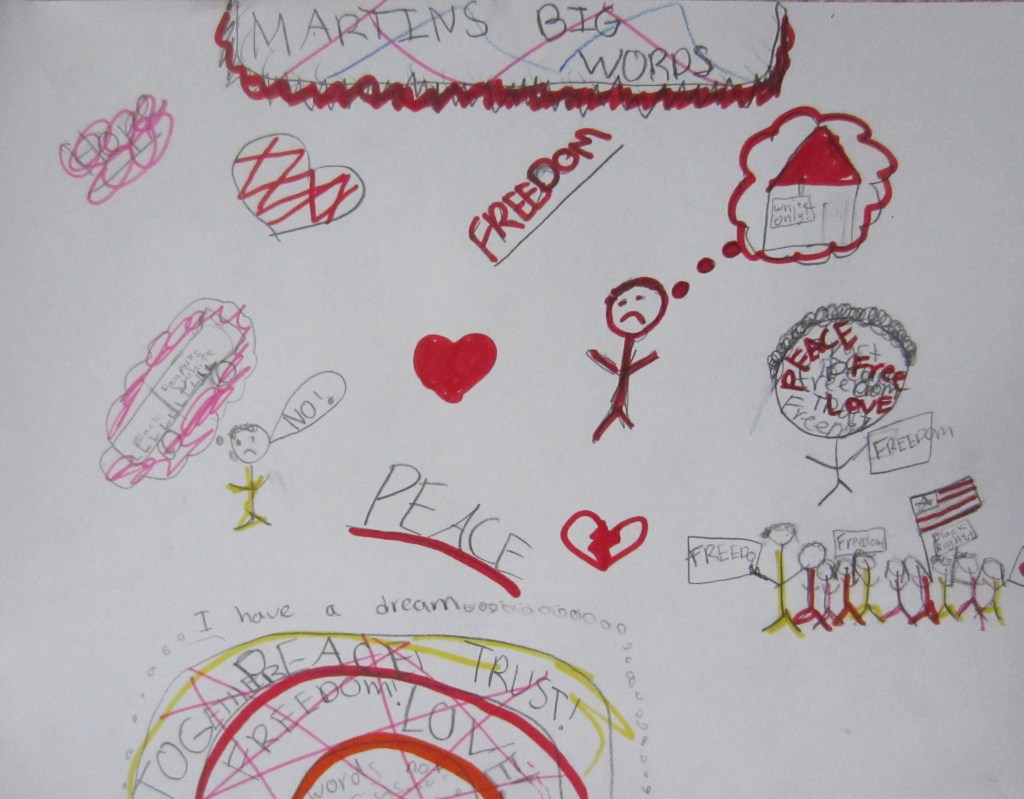 Now, the students were ready to sketchnote.  I explained that I was going to slowly read the book, Martin’s Big Words by Doreen Rappaport.  I asked students to share what they already knew about Dr. King’s life and work.  Some students proudly shared their knowledge, while other continued to ask questions. Soon they were ready to focus on the story.  I chose this book because it focuses on the nonviolent concepts Dr. King taught and believed.  I wanted these concepts to be the focal point of the students’ sketchnotes.  In this way, I believed the students would continue to remember King’s big words and the peaceful way in which he led others to protest against inequality. King’s words were so important then and are incredibly crucial now: freedom, love, God, faith, goodness, kindness, courage, trust, compassion, together, equity, justice, bravery, equality, care, determination, respect, unity, resilience, hope, and dream.