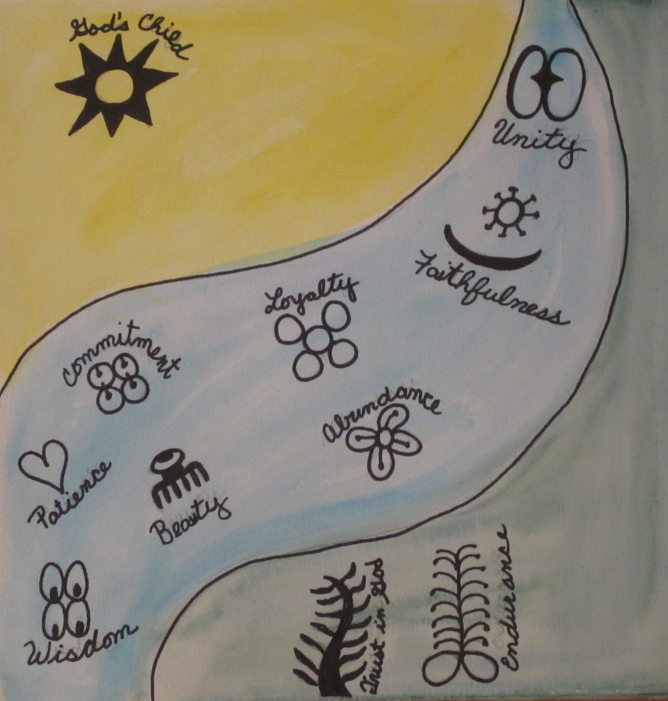 When I happened upon Nana Akua Goes to School by Tricia Elam Walker and April Harrison in our school library, I knew I held a special gem in my hands. And I was eager to think about how to share its gifts with our Kindergarten and 1st grade students. The book recounts the relationship between Zura and her grandmother, Nana Akua, whose names means “born on Wednesday” in Twi, the language of Ghana. The children in Zura’s class are celebrating Grandparents’ Day and are asked to invite their relatives to come to school and share their stories. Zura is a bit worried about her grandmother coming to school because Nana Akua has scars on her cheeks from an old West African tradition where parents put marks on her face to show which tribal family she belonged to. These marked represented beauty and confidence. Zura fears that her classmates will be scared of Nana. Of course, Nana is a wise woman and when she visits, she brings with her calm understanding and shows the beauty of her culture. She explains the Adinkra symbols to the children, having them choose one that represents themselves, and paints the symbol on each child’s check. The book’s endpapers show each Adinkra symbol, and I contemplated how best to share this story with our students. I practiced making the symbols and creating some of my own. When I read this book the students, I will encourage them to explore and create these symbols also.