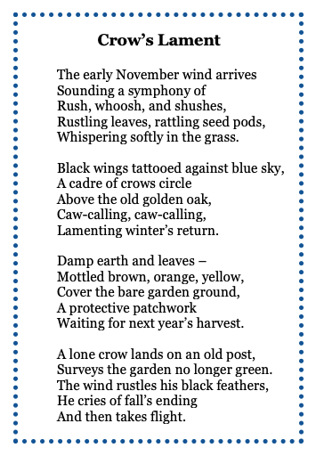 Thank you for your Autumn poetry. I especially like the Crows Lament and wonder if you would like to join my Bedecked in Autumn Gallery of Artistic Expressions. You can see what other slicers’ offered in Edition 2 of the Gallery at https://beyondliteracylink.blogspot.com/2021/11/a-slice-of-bedecked-in-autumn-gallery.html.Let me know. I plan on adding one more section since some poems are still coming in.