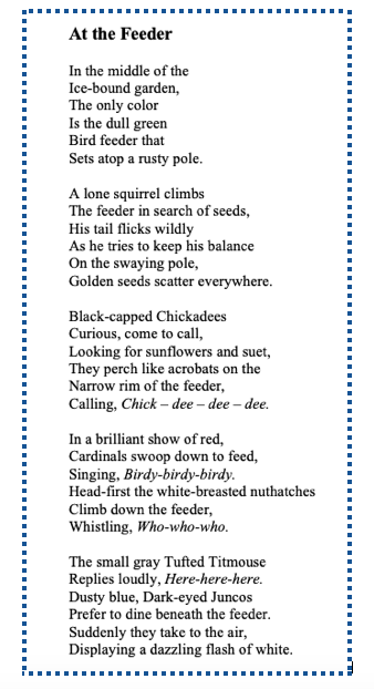 It is time of gathering. Bare branches stretch up to the sky. The last of autumn’s glorious colored leaves cling to the trees. Squirrels and chipmunks scurry across the frozen ground retrieving nuts and seeds they have collected. An ever- changing assortment of birds alight on branches, flit from fence post to fence post, come to feed on the seeds a samaritan has left on the ground. This time of year is a time for celebration, a time to bring friends and family together, a time to reflect for all we are grateful for. And still I feel a sense of sadness. A loss for the green and growing. A loss for summer’s promise and spring’s renewal. I await the winter mornings with trepidation. But her icy fingers beckon. and I know I must follow. Everything has a season. I am fortunate to live in a place where nature surrounds me. I take comfort in the industrious birds who decorate the landscape before me.
