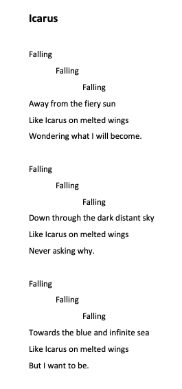 Recently, my husband and I traveled south to visit family for the holidays. As he has done on all our road trips, my husband curates music, radio shows, and intersperses his own running monologues critiquing economics, art, fitness trends, and politics as I drive.. He is indeed a Renaissance man. As he talked, he mentioned Icarus in passing. At once, words popped into my head, and I recited to him: “Falling, falling, falling – down through the distant sky – like Icarus on melted wings – Never asking why.”