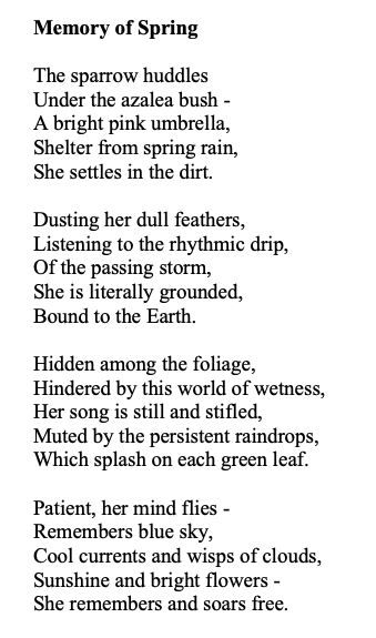 My inspiration for “Memory of Spring” comes from NaPoWriMo, or National Poetry Writing Month: 30 Poems in 30 Days, which was created by Maureen Thorson. Today, the writing prompt was to write about good fortune and possibility. And I also received inspiration from Verse-Love, Ethical ELA, which was created by Sarah J. Donovan. Stacey L. Joy, a poet and National Board-Certified Teacher, suggested we write about joy and liberation.