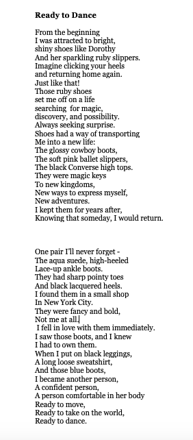 My inspiration for “Ready to Dance” comes from Sarah J. Donovan’s site, Verse-Love, Ethical ELA. Today’s prompt is by Andy Schoenborn, an award-winning author and high school English teacher in Michigan at Clare Public Schools. He suggested that we write in prose about a pair of unforgettable shoes, and then play with the structure and form as a poem tumbles down the page. I also received inspiration from NaPoWriMo, or National Poetry Writing Month: 30 Poems in 30 Days, which was created by Maureen Thorson. NaPoWriMo. Today, they suggested writing a poem describing an opening scene from your life.