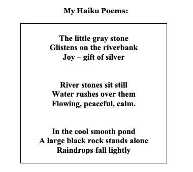 The best part for me is that I get to witness our students grow as readers and writers. By the time students get to 5th grade, they are putting it all together and coming up with a haiku in three stanzas. This writer lacked confidence when she was a young writer, and now you can see in her composition how far she has come. Haiku is a celebration not only of nature but of growth and possibility.