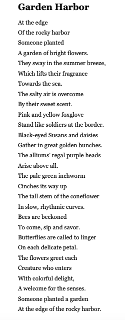 The plant life is colourful and busy. It’s great that somebody planted a garden next to a harbour, and it’s wonderful you used is as an inspiration to write a poem.