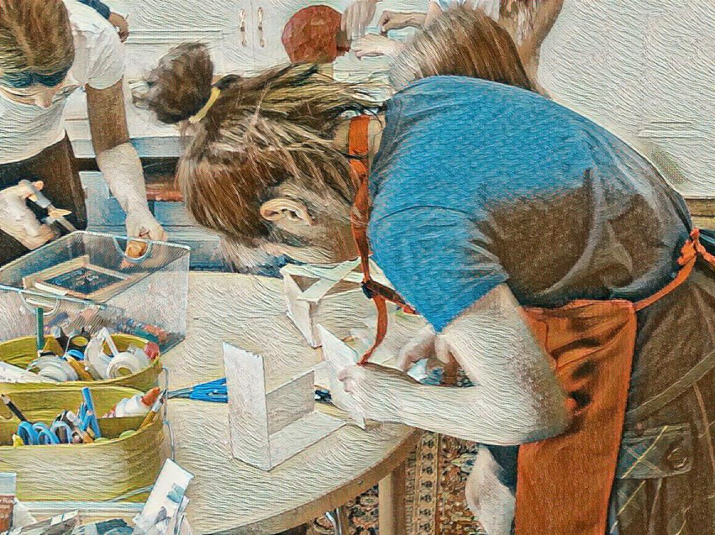 As I stopped to survey their work from my perch on the stairs, I noticed that we were teetering on the brink of capacity. The rest of the wonder crew were using balsa wood, cardboard, and hot glue to make various structures, signs, tine abodes for rock people, jewelry storage stands, and other imaginative gadgets. Every square inch of this small space was occupied. One student, who has been intent on making a large wooden box was busily gluing on the floor in my adjacent office. From this height, I also noticed what a great mess they were creating: balls of yarn rolled across the floor, bits of balsa wood scraps scattered over the rug, a trail of red paint crossed the room from table to garbage can. It was a good thing I bought two dozen craft aprons so at least the students could remain relatively clean. The paper-mâché crew were up to their elbows in white goo as they patted their stick spheres. I realized that this mess-making was making everyone happy. It created a calming atmosphere. Children need these sensory experiences. Curious, I asked the group, “How many of you have a place at home to make art and get messy?” Not one child raised her hand. I was not surprised, but it saddened me. It made me doubly aware of how much the children need this time and space to create and get messy. This realization made me more patient with spills and splatters. Learning is a messy process. Children need lots of practice getting messy, trying, failing, and trying again. So when Leah suddenly called out, and I see the glue solution has spilled all over her apron and down her legs, I smile, and I say, “It’s okay, go to the sink. It washes right out.”