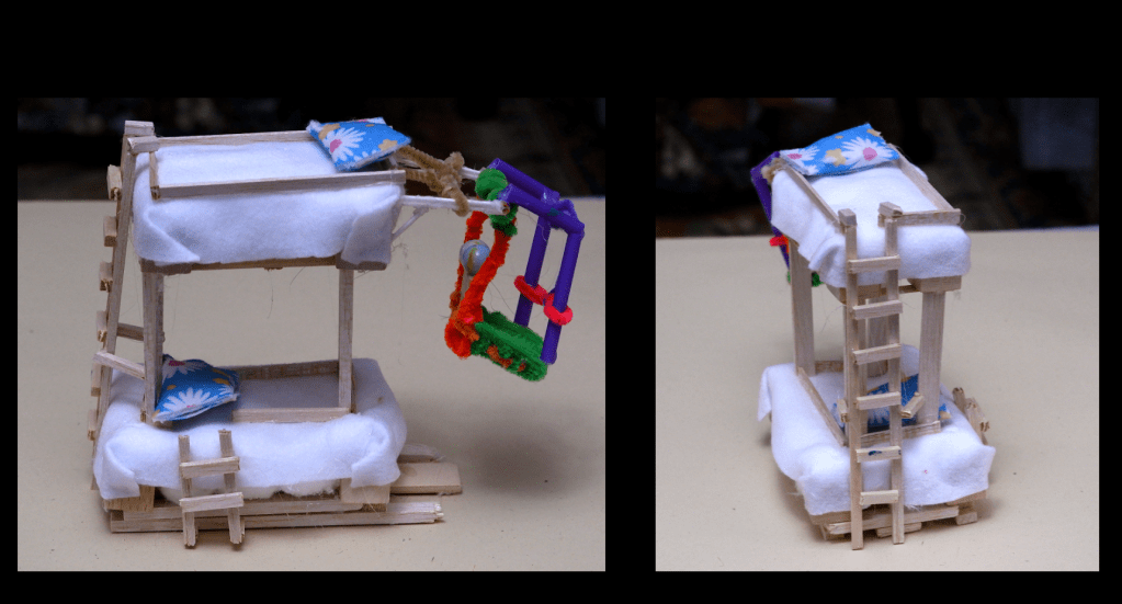 Liv’s current project was a bunkbed made from balsa wood. She designed, cut, and glued her construction all by herself. She didn’t ask me for a single piece of advice except at the end when she needed some kind of weight to make the swing move freely. Yes, her bunkbed has a swing made from straws and pipe cleaners. Marbles were glued on as counterweights. When I look at the ladders on Liv’s bunkbed, I smile because I realize how much gluing she had to do to construct them. Indeed, she no longer has a fear of getting burned. Her confidence has grown so much, and though still very shy, she also knows that she is a designer and builder. Liv has confidence in making things. She does not quit.