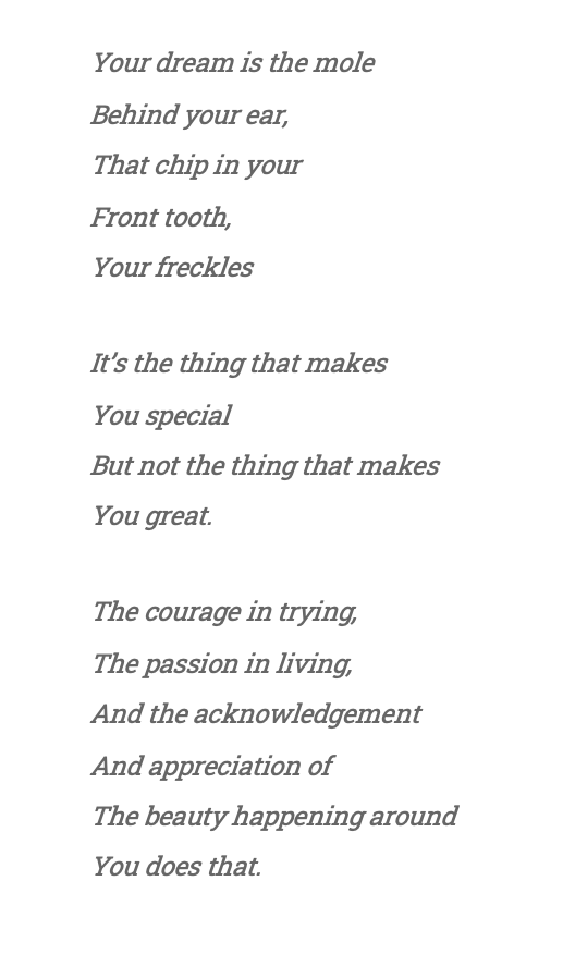 “Yes,” I thought.  What great advice for a successful life.  It’s what I believe: the ordinary, the small moments, the unique gifts in all of us and all around us, are what marks success. As with most moments of delight, Reynold’s book prompted me to write my own poem.