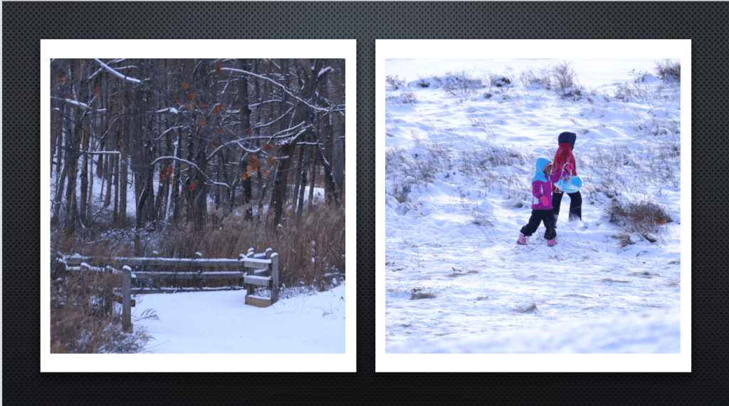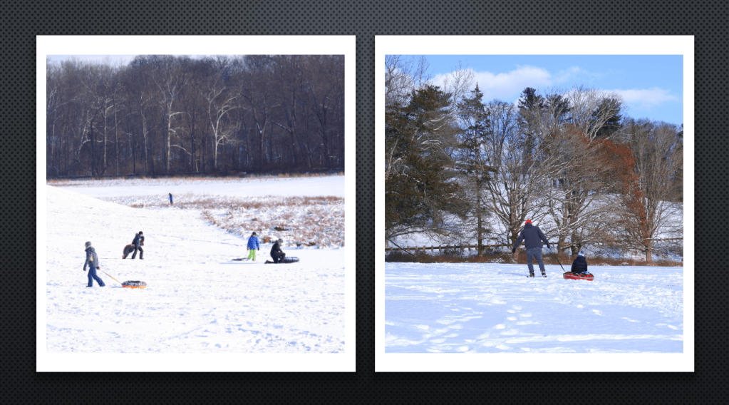 One of the favorite things for my loved one and I to do after a snowfall is to go outside to many of our local parks and hike looking for ways to capture the beauty with our cameras. I love iced-over rivers, branches laced with snow, fences and railings dripping with icicles. On a recent trek to the park, I watched families sled down a small but slick slope. It was fun to see parents cheering on their children. One little girl with bright pink cheeks had a death grip on the edges of her snow disc as she screamed all the way down the hill. She ran back up shouting, “That was TERRIFYING! Let’s do it again!” I had forgotten how terrifying and exhilarating sledding was. If I had a sled with me, I probably would have hurtled myself down the slope. I have to comfort myself as a bystander watching well-bundled children speed past screaming, laughing, and having the time of their lives. Definitely a time for sledding adventures to remember.