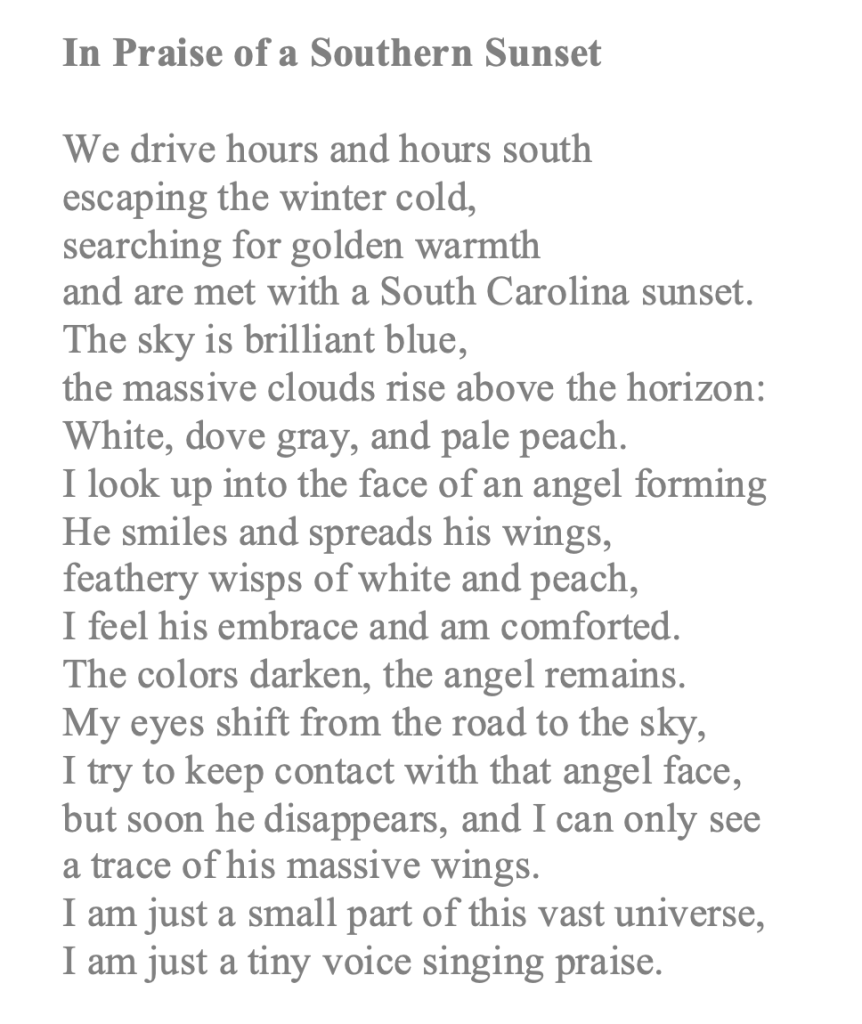 As my husband and I drove south from New Jersey during my winter break, we watched in awe as a sunset gracefully appeared in South Carolina. Witnessing the evening sky renewed my faith. Nothing could make something so intricately beautiful, only God. I watched as His hand moved the clouds and shift them into ethereal shapes and soft colors. I believe this was a reminder from God that there is still hope for the future, that we were made to delight in this natural world for the short time we are here.