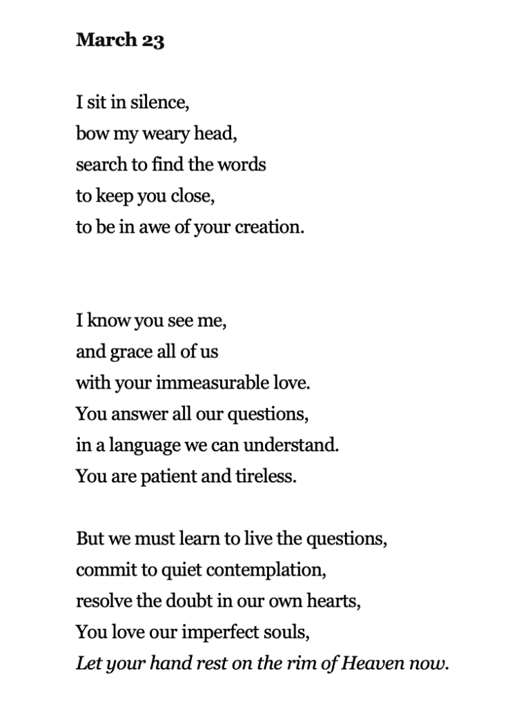 This is my fifth year taking the SOL Challenge. In the past, I wrote poems about birds for 31 days, then flowers for 31 days, and then last year I wrote about food. This year, I have been inspired by Rainer Maria Rilke’s Book of Hours. I have read this book twice and noted lines and phrases that stood out to me. My plan for March is to write a poem each day based on Rilke’s poetry.